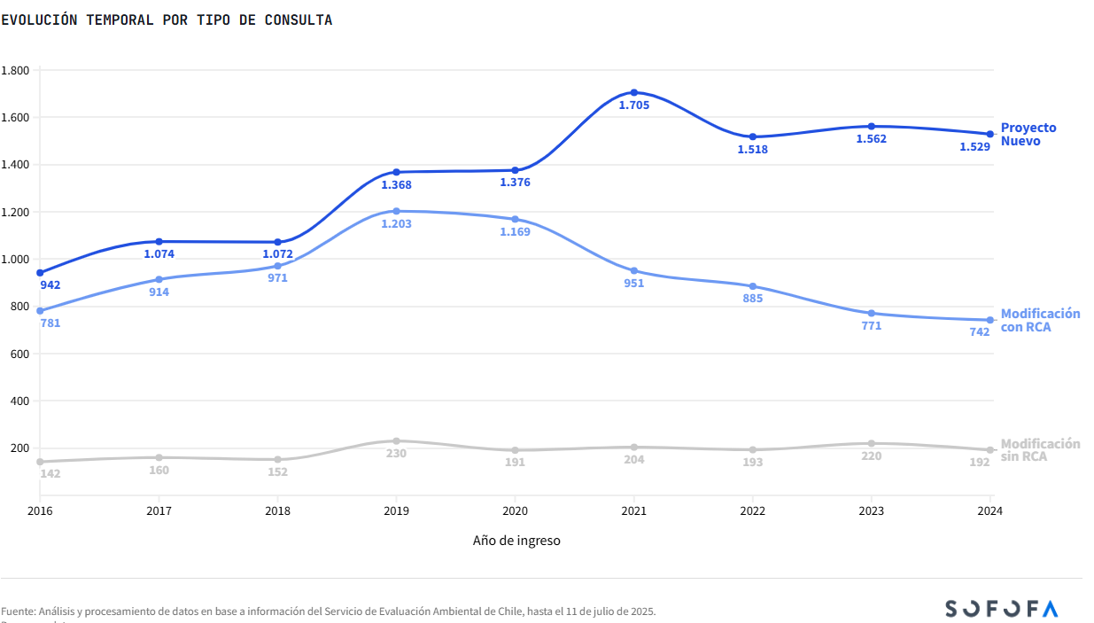 La evolución histórica de las consultas de pertinencia entre 2016 y 2025 muestra dinámicas diferenciadas según el tipo de consulta. Las consultas vinculadas al ingreso de proyectos nuevos son las que muestran mayor volatilidad, alcanzando un peak histórico cercano a 1.705 en 2021, para luego descender gradualmente hasta 1.529 consultas en 2024. Esta tendencia coincide con el período de mayor incertidumbre económica y regulatoria postpandemia.