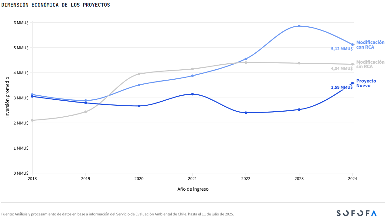 Las modificaciones sin RCA también muestran una tendencia de crecimiento, aumentando desde $2,1 millones de dólares en 2018 hasta $4,34 millones en 2024. Los proyectos nuevos, por su parte, muestran mayor volatilidad, con un peak de $3,59 millones de dólares en 2024.